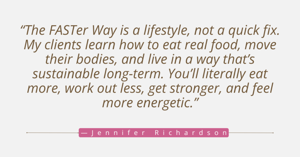 Today, Jennifer leads clients through her six-week FASTer Way program, offering one-on-one coaching, education, and ongoing support. Each participant receives access to a mobile app that includes customized nutrition goals, daily workouts, and meal plans.