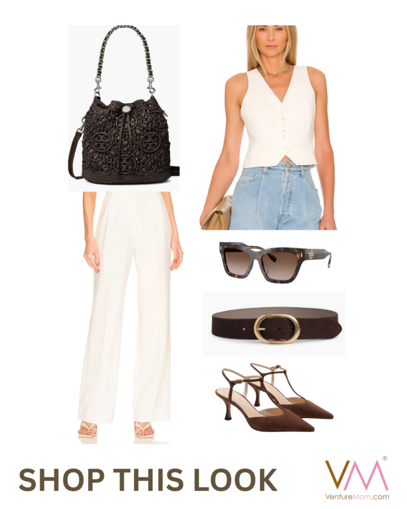 I’m loving these ivory pleated pants and vest with their chocolate suede belt. These suede sling backs are the perfect vibe. Add this @toryburch bucket bag in cocoa and her tortoise sunglasses for more brown accents.