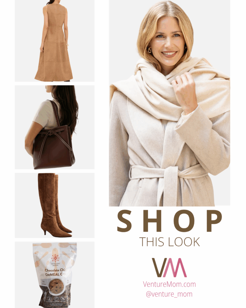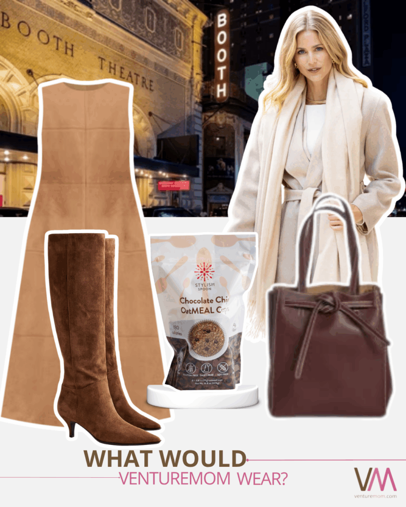 I’m going to the theatre with a group of girls and this buck suede dress from Tuckernuck would be perfect for a city outing. Add a ruffled cashmere wrap from women owned @sophiacashmere to throw on or off depending on the weather. I’m loving these slouchy black boots from JCrew and this black bag from women owned @harperlawrence. For the train ride in, grab a @stylishspoon oatmeal chocolate chip cup for energy. Now it’s showtime.