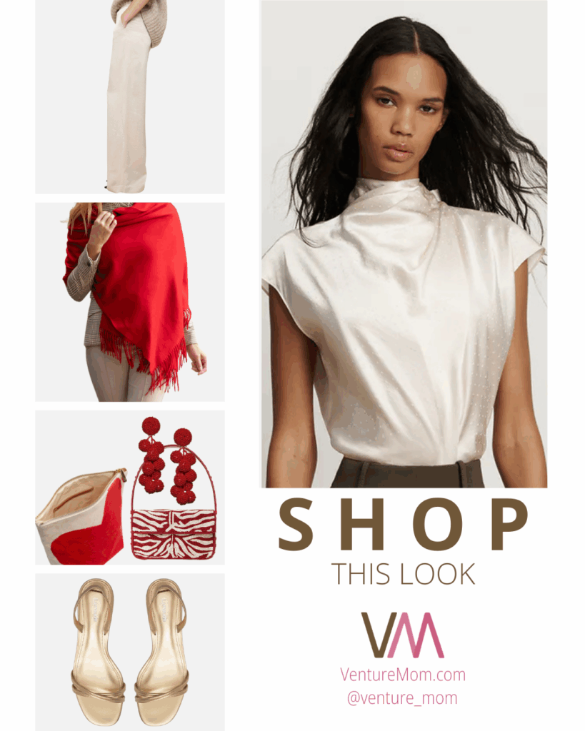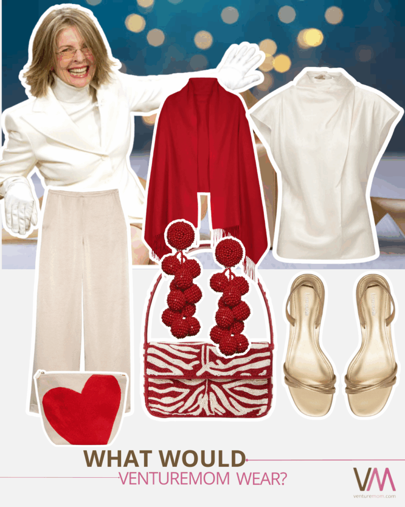How about winter white to honor my favorite actress Diane Keaton. These palazzo pants from Banana Republic in hammered silk are fab. Pair them with a white cropped sparkly top. Using white as your base, add holiday colors like red and gold. I’m loving this red wrap from @sofiacashmere, the gogi berry @sachinandbabi earrings and the @staud.clothing red and white bag. Now what to gift? How about this darling cosmetic bag from @francesvalentine.